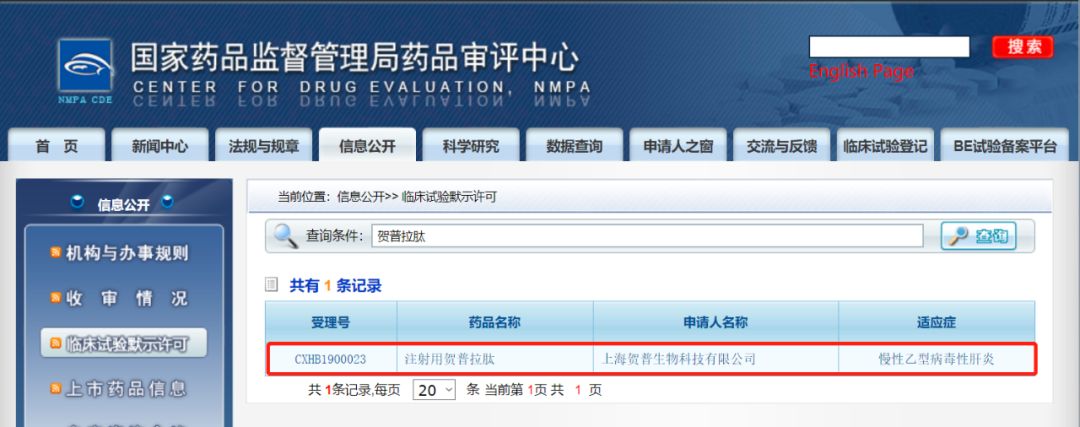 據(jù)來(lái)自國(guó)家藥品監(jiān)督管理局藥品評(píng)審中心網(wǎng)站的消息,上海賀普藥業(yè)股份有限公司研發(fā)的First-in-class在研乙肝新藥賀普拉肽(Hepalatide)已經(jīng)獲得NMPA臨床試驗(yàn)?zāi)J(rèn)許可,將進(jìn)入Phase II/III期臨床研發(fā)階段。