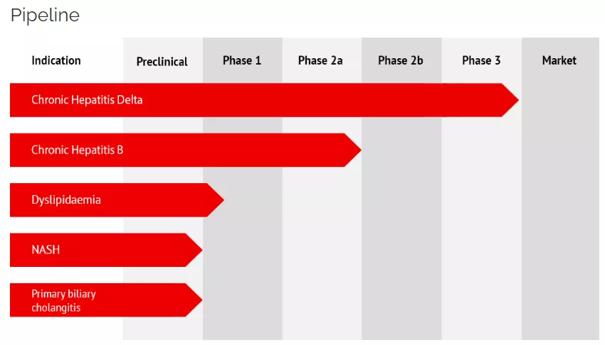 此前在2020年8月4日,由德國(guó)生物技術(shù)公司MYR Pharmaceuticals研發(fā)的Bulevirtid(商品名HEPCLUDEX)獲得歐盟委員會(huì)(EC)有條件上市許可(CMA),成為全球首款丁肝治療藥物。Bulevirtid通過(guò)結(jié)合HBV/HDV感染受體NTCP,阻斷HBV/HDV進(jìn)入肝細(xì)胞。Bulevirtid的獲批證實(shí)了病毒進(jìn)入阻斷策略治療丁肝的有效性,成為歐洲地區(qū)首個(gè)獲得批準(zhǔn)用于成人慢性HDV感染治療的突破性療法。目前,bluevirtide目前已經(jīng)在法國(guó)、德國(guó)、奧地利上市,美國(guó)FDA也曾授予過(guò)bluevirtide治療慢性HDV病毒感染的孤兒藥資格和突破性療法資格。